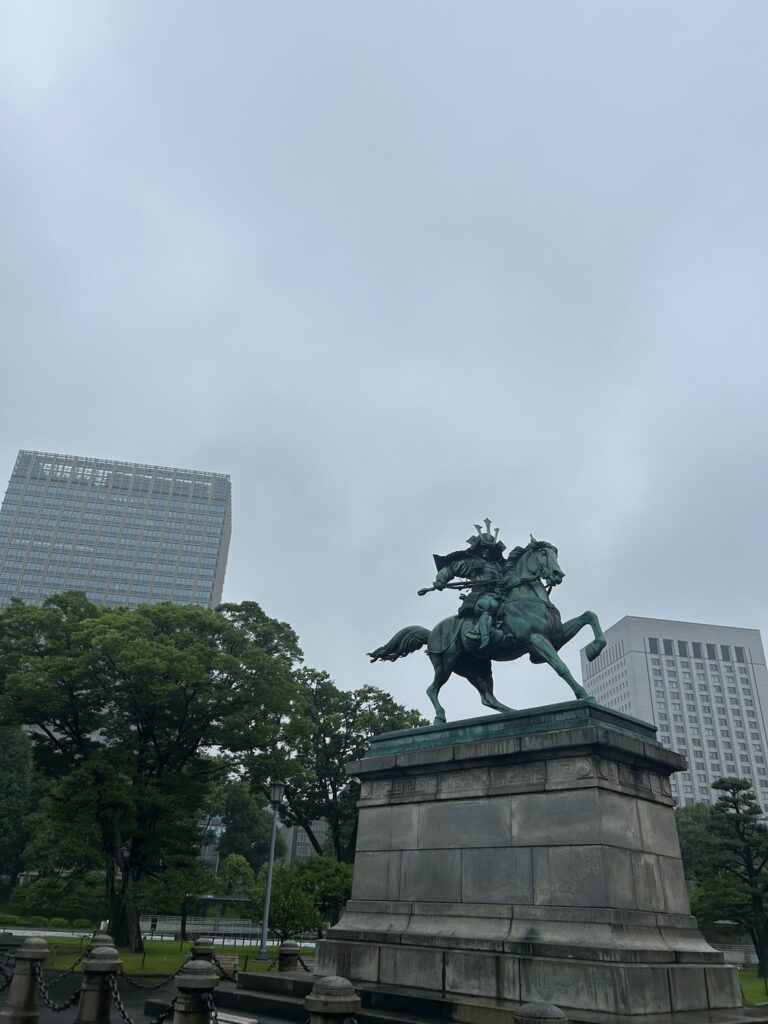 静かな空気の中で見上げた楠木正成像。