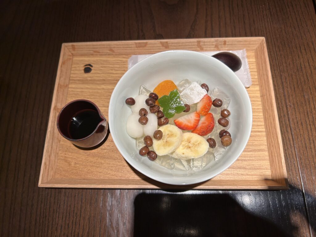 寒天とフルーツ、つやつやのあんこが美しく並び、「やっぱり甘いものは別腹だね」と笑い合いました(^^)